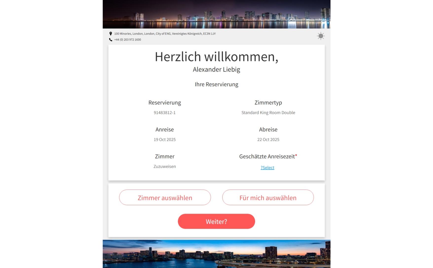 - Anreisedatum, Abreisedatum, Anzahl der Zimmer, Kategorie, Preiscodes, Zahlungsanweisungen, andere wichtige Grundinfo – schnell und übersichtlich